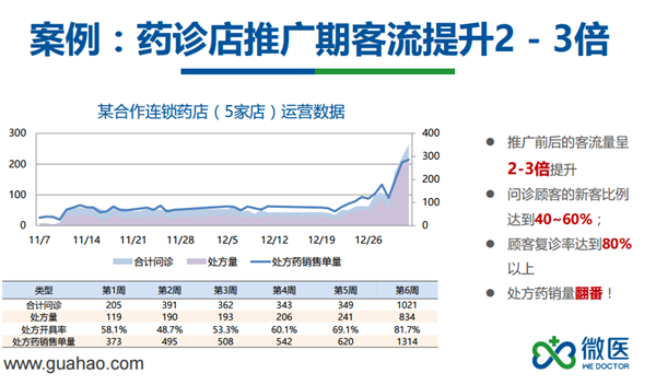 药诊店对某连锁药店5家药店推广期的客流数据的监测也显示,在药诊店推广期内,这5家门店的客流量提升了2到3倍,其中问诊顾客的新客比例占到了40%~60%;用户复诊率达到80%以上,处方药销售翻番(图5-2)。