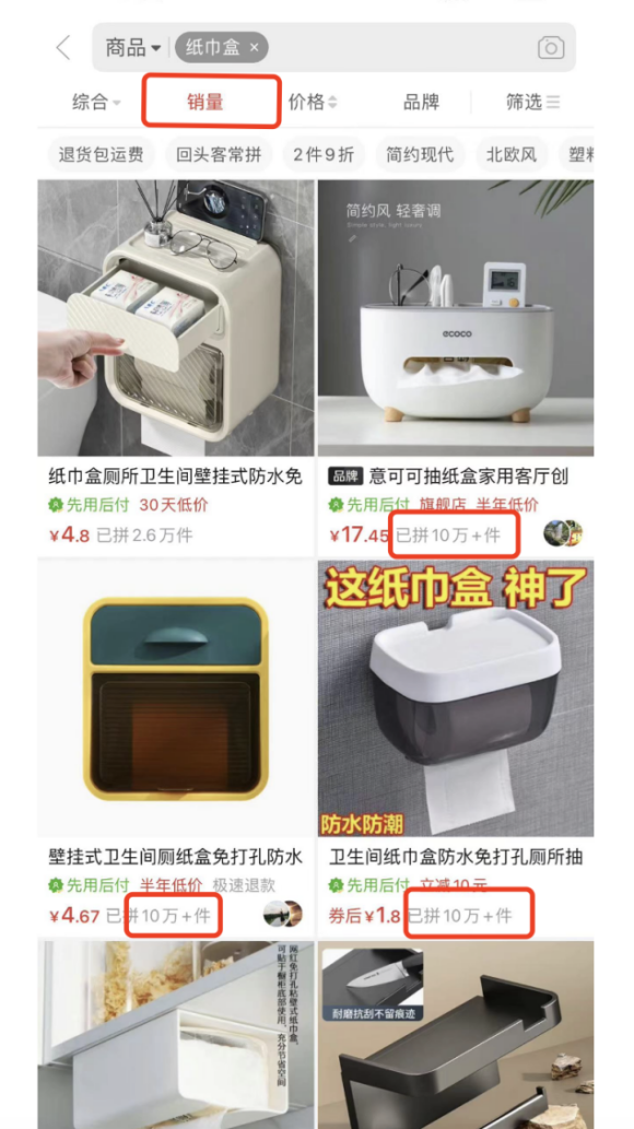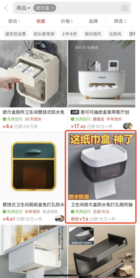 以纸巾盒为例,按照销量排名,找销量最高的商家,找出至少10家商家作为参考,逐一筛选。