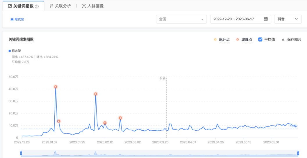 这里我随便找一个产品,通过巨量算数给大家演示一下。如图2.4所示是2022年12月20日至2023年6月17日期间,晾衣架这个产品的搜索情况。从图中可以看出,这段时间晾衣架这个产品的搜索量是缓慢增长的,虽然整体增量不是很大,但可以确定这个产品的需求量是在增加的。当然,需求增加还有一个原因是抖音电商整体的体量在增长,所以平台上的各种需求也会跟随平台的增长而增长。