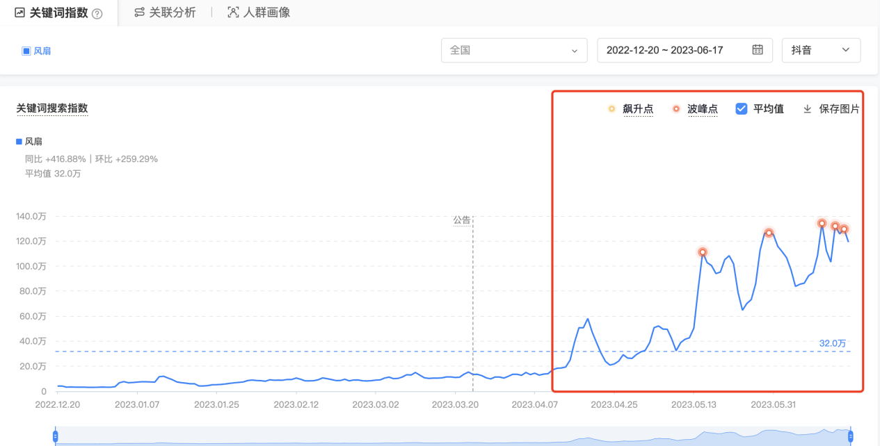 如图2.5所示,在2022年12月至2023年6月期间,其中2022年12月至2023年3月搜索量非常少,从2023年4月开始,搜索量逐月大幅增加,由此可以看出风扇这个产品临近夏天时才会有大量需求。有人会说,这还用查数据吗,谁都知道风扇在夏天需求量大!但这里我要说的是,无论什么产品,我们都要查数据。做任何事情最忌讳的就是凭想像、凭经验去做判断,我们一定要通过数据分析了解客户真实的需求,而不是没有任何依据地凭想像判断,有时候客户的真实需求是与想像背道而驰的。比如风扇这个产品,我们以为是夏天才有需求,应该在每年的六七月份开始销售,但通过搜索指数可以发现,在4月初的时候需求量就已经开始提高了。有经验的商家可能在3月就开始布局卖这个产品了,等到搜索量达到巅峰的七八月份,这些商家已经进入清理库存的阶段了。