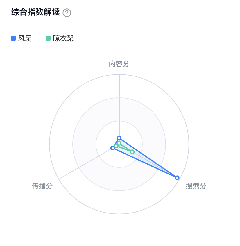 我们还是以风扇和晾衣架这两个产品为例,来看一下这两个产品的市场讨论热度。从图2.6中可以看出,风扇的搜索分比晾衣架高,也就是需求量更大,而这两个产品的共同点就是内容分和传播分都很低。这两个产品其实都不能算作好的品类,但不代表不能做,实际上如果这个产品的搜索分高,是非常适合做货架电商的。