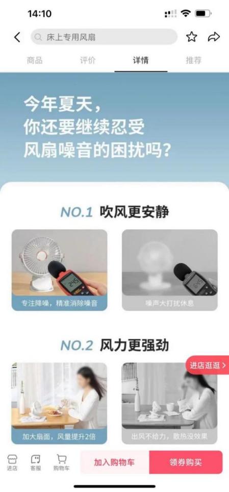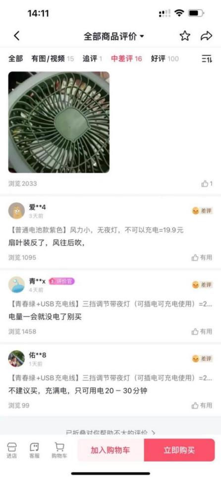 我们还是以风扇为例,打开一个同行的详情页可以看到这款产品是在强调静音,同时在客户的评价里,尤其是差评里可以看到,客户对产品的充电续航能力不满意,那么续航能力不足就是产品的痛点,如图2.7所示。