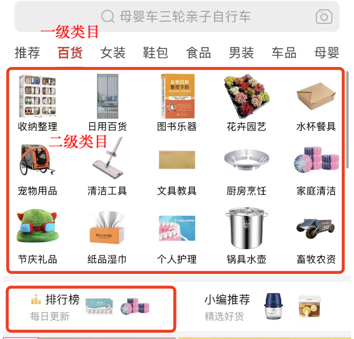 如图2.9所示,在搜索框下方,是拼多多的一级类目,比如百货、女装、鞋包等;一级类目下方就是二级类目,即一级类目的细分类目,图中所示为百货的细分类目。我们可以找到自己感兴趣的类目,然后在里面寻找合适的供应商。
