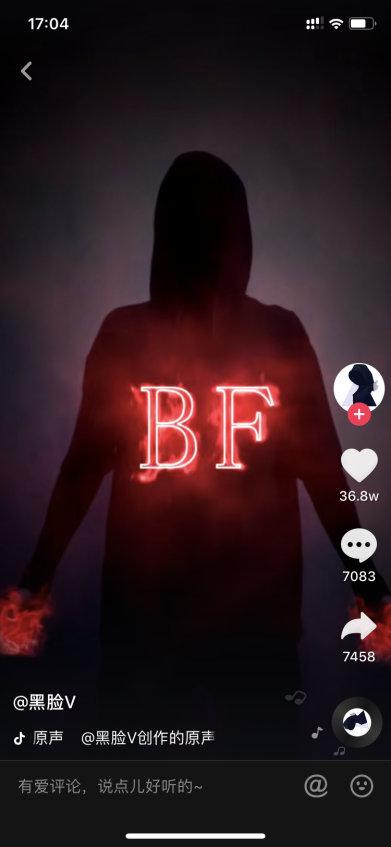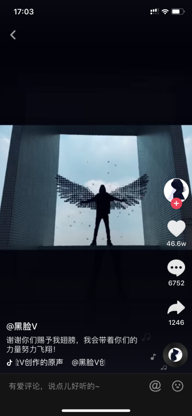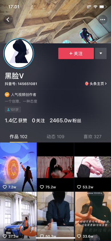 依靠独特的剪辑技术火起来的账号较多。比如拥有2465万粉丝的“黑脸V”(图5-20),全部通过剪辑技术,制作炫酷视频,吸引粉丝。