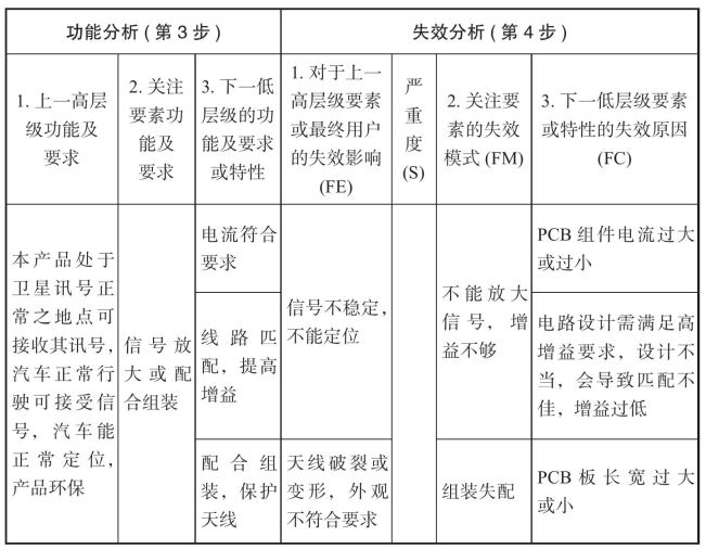 从这个表中可看出,功能分析和失效分析的步骤是:先要确定关注要素,是系统、子系统还是部件?确定功能及要求—填写关注要素的失效模式—填写上一高层级功能及要求—填写上一高层级针对相对应失效模式的失效影响(高层级失效模式)—填写下一低层级的功能及要求—填写下一低层级针对相对应失效模式的失效原因(下层级失效模式)。
