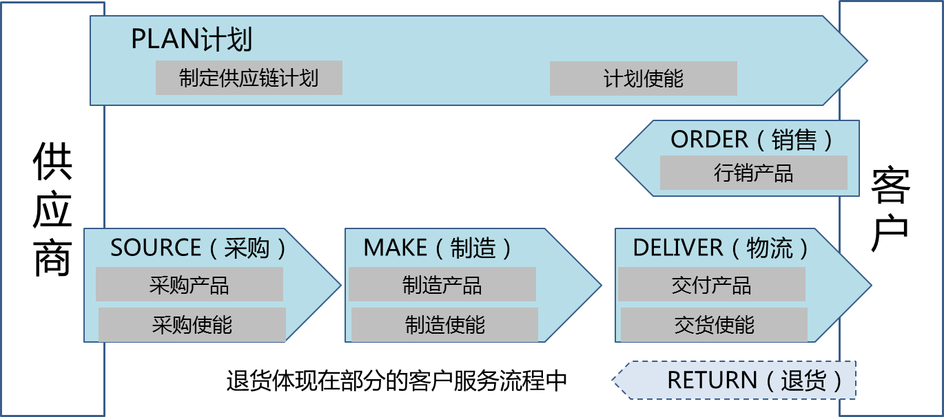 通过对业务模型的分析,供应链的业务模块由六大部分组成,分别是客户的销售需求、内部的计划、采购、制造、物流及一部分的客户服务(退货)。这些业务组成了供应链模块的日常业务,要对这些业务进行分析、总结、提炼,才能整理成合适的业务架构。