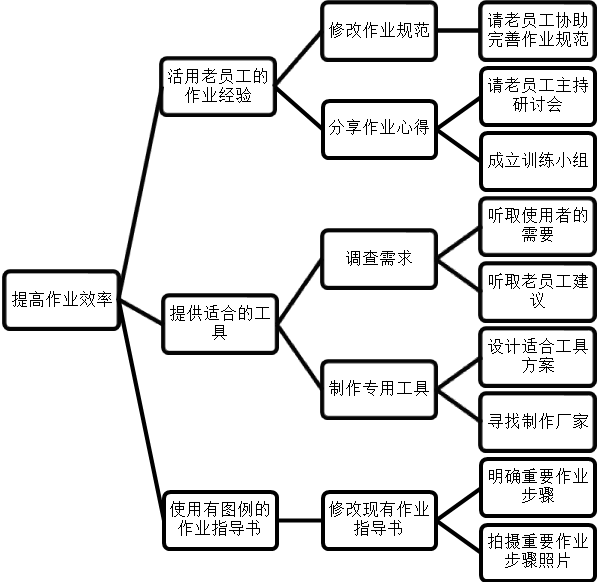 利用系统图法的概念,把达到某一个目的所需要的手段层层展开成图形,就能对问题有一个全貌的认识,并且能找到问题的重点,从而找出实现预定目的的最理想方法。系统图法不仅对明确管理的重点、找出质量改进的方法和手段十分有效,还是企业管理人员不可缺少的“目的—手段”的思考方法。