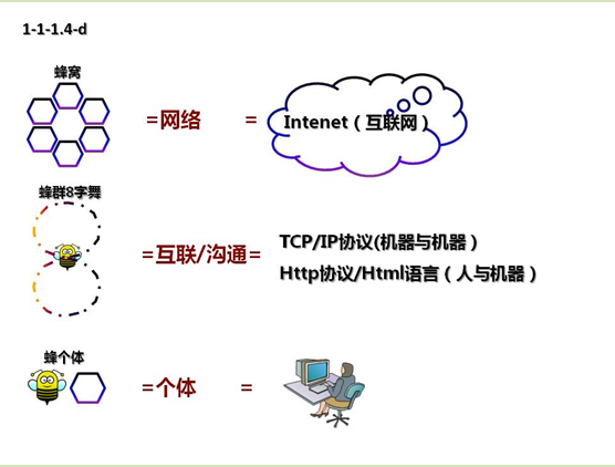 蒂姆·伯纳斯·李发明了万维网及Http协议。他认为应该存在一个假想的、虚拟的空间,使得不同的电脑、不同的电脑软件系统能够交换数据。1991年,伯纳斯编写出HTTP(超文本传输协议)和HTML(超文本标记语言),就是电脑之间交换信息时所使用的语言,通过Html网页,一个普通人即使不懂电脑不懂网络,也可以随意上网连接上任意一台机器。而每次键入网址时出现的http,伯纳斯命名为World Wide Web,它代表网页概念,就是人连接计算机的窗口。通过它,人与机器,人与人的连接开始了。互联网就是一个一个蜂群网络自治系统,不断扩张,每一个人、每一台智能终端(PC机、智能手机、智能外设等)都是一个蜂虫个体,而TCP/IP协议、Http协议、Html语言就像是蜂虫的“8字舞”一样,用于沟通与互联。