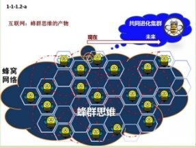 互联网正是人类社会中最大的一个蜂群网络,它的发展就像这蜂群系统一样。你可以想象一个人类大脑群体思维记忆库的建立,最初的时候各个神经记忆节点的搜索路径是尚未建立的,当我们反复使用的时候就慢慢形成强的连接。在从前这些连接记忆节点的路径是微弱的,强连接是极少的,但是互联网出现后,这些路径瞬间全部亮起,所有记忆节点都可以在瞬间连接。