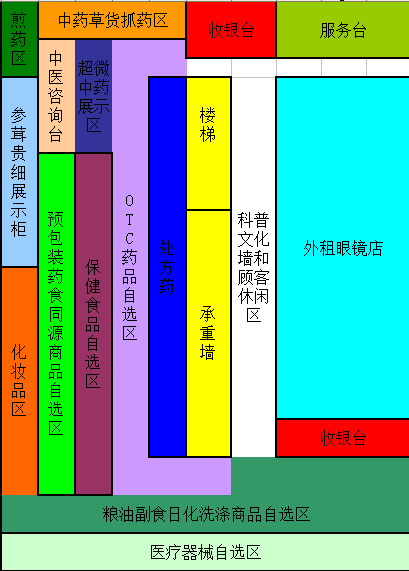 一个位于二楼的药店示意图(如图1所示,改造前的陈列区划图),总面积接近1700平方米,药店净面积1000平方米。楼梯入口位于店堂近中央位置,又有承重墙将整个店堂几乎分成两半,整个店型狭长且不规则。原陈列将药店最吸客的中药和处方药放在最里面,然后沿楼梯口后左拐方向依次陈列副食、日化、洗涤用品、化妆品、药食同源商品等。