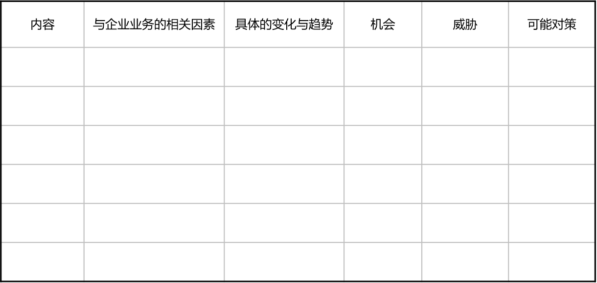 企业根据自身的产业特点,选择对企业发展最相关的几个(一般不超过10个)宏观与产业环境的影响因素,按影响程度的大小进行排列,描述其变化的程度和变化的趋势。这些变化对企业带来哪些机会和威胁,企业可能采取的对策是什么?