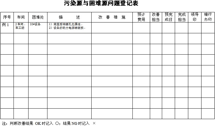 困难源是指妨碍员工进行清扫或操作等行动的原因或部位,这里的行动包括清扫、点检、注油、紧固、操作、调整等,如电机外壳的散热槽,清扫起来非常困难,设备顶部的仪表因为比较高而看不到,点检起来很困难,设备固定罩妨碍了注油等。