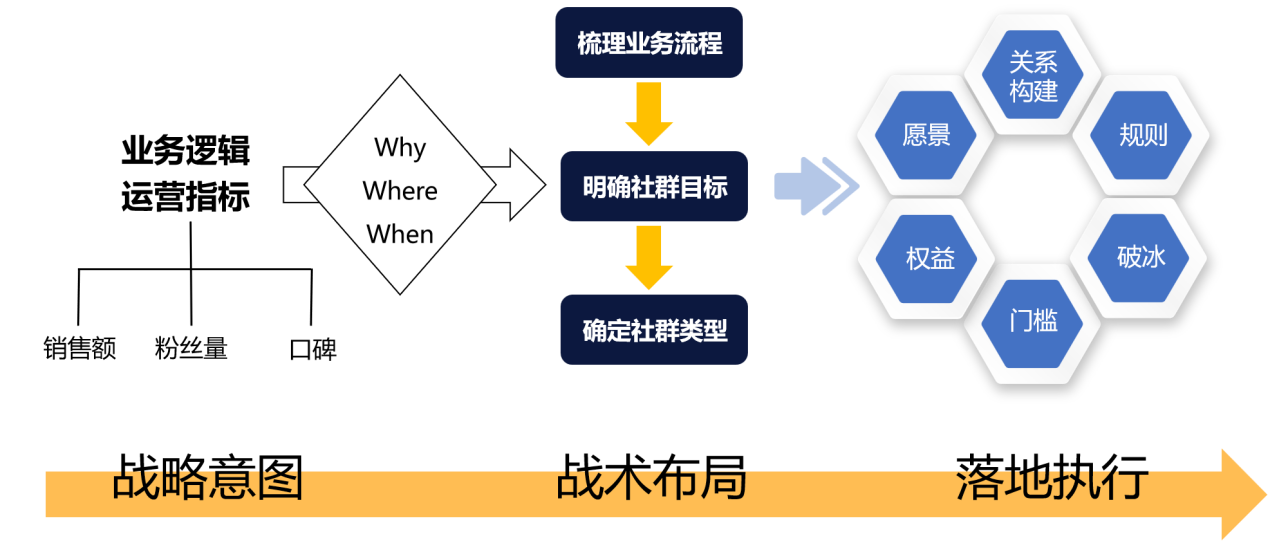 先根据企业自身发展情况,通过业务逻辑梳理,明确社群运营的战略意图,再根据运营指标的拆解来确定社群运营的战术布局,最后再通过社群矩阵搭建和6大核心设计工作,帮助我们完成从战略到战术再到最后执行,这整个过程确保可以高效落地。