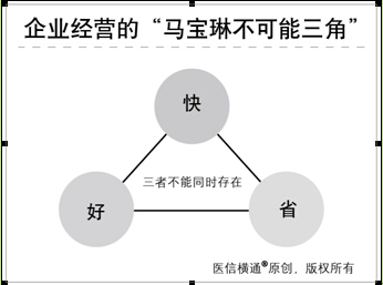 我的观点是:“快、好、省”在企业经营中不可能同时出现。“快”意味着销售增长速度快;“好”意味着销售质量或者市场掌控质量好;“省”意味着投入少。如图3-3所示。