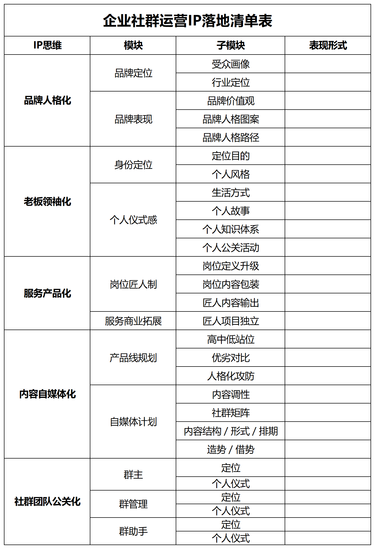 对于大部分的企业、品牌主而言,本身就拥有属于自己的品牌IP。在这种情况下,运营社群时是不需要重新打造社群品牌IP的。只需要思考,如何将自己的品牌IP落地到社群运营上。在这里提供一个比较好用的用户清单工具表,帮助企业社群运营IP落地执行。如表9-2所示。