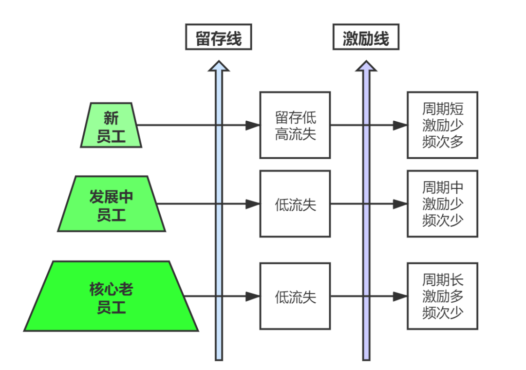 ​ 短/中/长期目标法则:短期的目的为新员工培养,中期的目的为核心员工的业务提升,长期的目的为老员工的留存。三档激励的设置通常需要建立在员工工作生命周期来考量。我们先假设前置仓拣货员通常在职的生命周期为2年,不妨定义奖励周期为月度(1个月)短期,季度(3个月)中期,年度(12个月)长期+连续两年额外奖励。