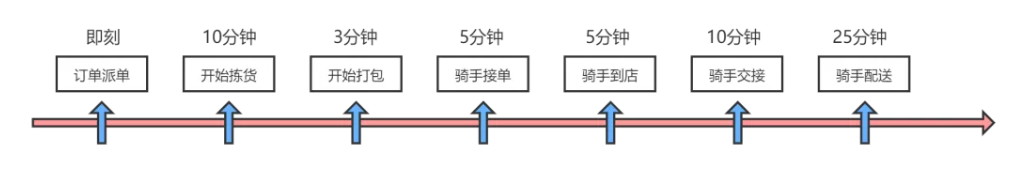 ​ 骑手配送:完成交接后,骑手出发前往用户家中,预留25分钟配送时长。