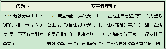 :针对薪酬变革小组不明确,相关宣导不到位,员工不了解薪酬改革意义的问题,我们就成立薪酬改革攻关小组:由基地生产总监挂帅。对这个基地来说,生产总监其实就相当于总经理了。因为整个佛山基地完全由生产总监负责,老板只是关注整个集团的事情了,所以也就是相当于整个工厂的一把手在抓这件事。