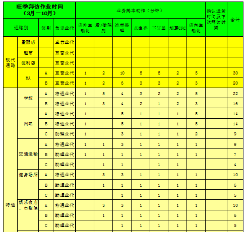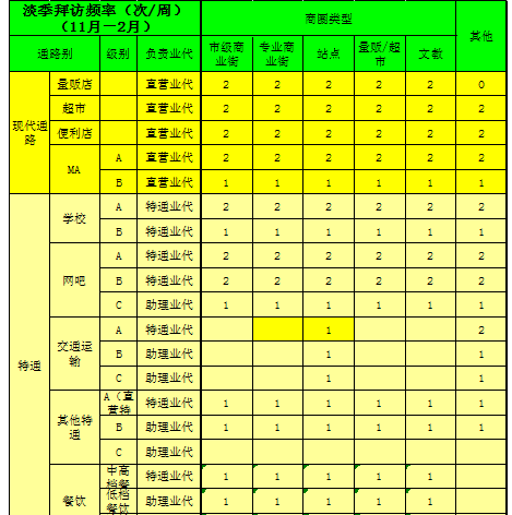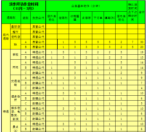③ 客户的拜访频率根据商圈的重要程度、通路的重要程度及客户的级别确定,明显比旺季的客户拜访频率低。