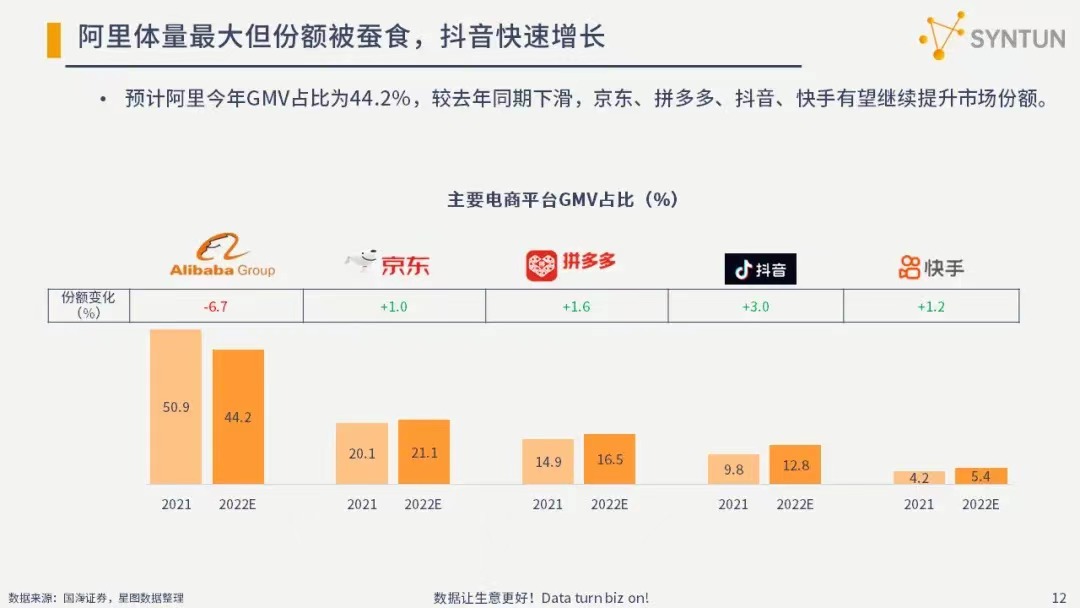 抖音目前的阶段是淘宝最早期的情况,而它抢夺的市场份额来自淘宝和京东等平台。附图1是2022年国海证券的一份报告,可以看出抖音的市场份额是增长最快的,虽然阿里系体量最大,但被蚕食得也是最多,市场份额在下降。