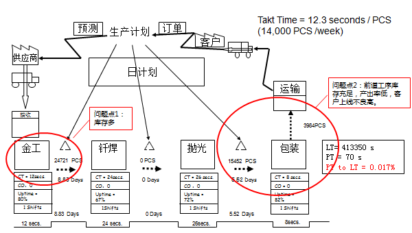 通过价值流分析,发现该供应商生产周期长达14天。不能满足7天的交付要求。库存压在金工和抛光。