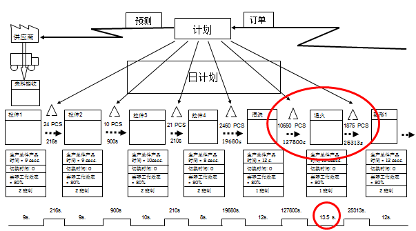 从H公司的计划模式可以看出,供应商如果交付周期短于7天,则可以保证供货。于是项目组对S公司进行了价值流分析。如图9-7所示。