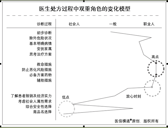 这个模型把医生诊疗处方过程中的思维变化按次序勾画出来,是为了让大家容易理解,但是实际上人的大脑是飞速运转的,很多事情是同时得出判断的。比如,在救命阶段也会“了解病人报销和经济实力”,但是主流上、大体上是模型的次序,行动上更是符合模型描述的次序。