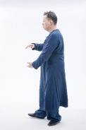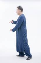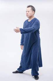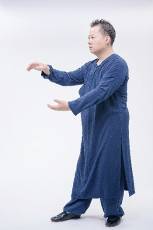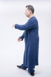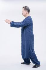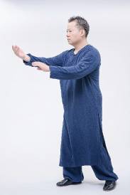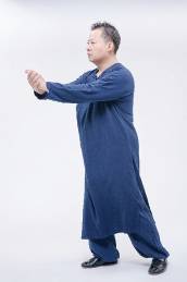4.右脚涌泉一踩,将所有重量与重心慢慢移交给左脚。在移交重心的同时,双手反方向移动,左手臂掤出,向身体正前方抬起至胸前三个拳头长的距离,右手由原来的胸前慢慢自然放下,手掌朝后,大拇指在裤腿缝处,中指微微翘起。脚停手停、手停脚停;一动无有不动、一静无有不静;此时,上半身向着45度的东北方向,两手背自然保持美人手。