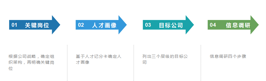 全面人才地图绘制包含四个步骤:根据公司战略确定关键岗位,然后明确岗位的人才画像,接下来再跟进人才画像确定目标公司,最后进入信息调研阶段。如图3-1所示。
