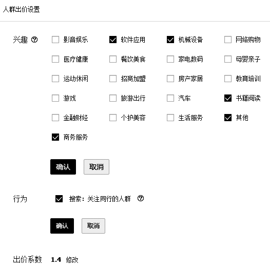第四项:【人群】。全称是【人群定向投放】,是指百度利用其长期积累的大数据,为每一个搜索者画像并标明其行为特征。如果我们做广告时愿意出高价,百度当然愿意把高价的广告投给指定的人群。图3-13是百度目前已有的人群分类,多为to C市场分类,少有to B市场分类,我的公司的账户能够选择的兴趣类目也只有软件应用、机械设备、商务服务、其他。做了一段时间的结果是其他类兴趣占多数,可见对于B2B行业,这个兴趣分类作用相对小很多。目前,百度对人群的行为标注并不完善,所以也只能关注同行的人群。出价系数,说白了就是你愿意花多少钱买这个大数据。比如我现在出价10元点击一次,1.4倍系数,就是我愿意花14元让目标人群来点击。