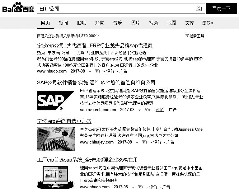 图3-10 在宁波地区用百度搜索“ERP公司”的首屏搜索结果