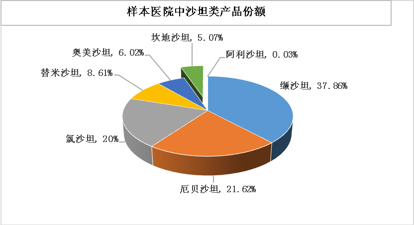 按照南方所数据,国内16个重点城市公立医院样本中沙坦类药物(含复方沙坦制剂)年销售额达到18亿元,占据整个抗高血压样本市场的36%,主流产品为缬沙坦、厄贝沙坦与氯沙坦。沙坦类作为降压一线用药,不但针对高血压作用明确,而且对糖尿病、心力衰竭及肾脏疾病等多种并发症疗效显著,相比其他降压药,具有更高的安全性。如图2-3、2-4所示。