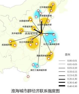 从城市群经济联系强度图可以看出,淮海城市群和山东半岛城市群、中原城市群联系最为密切,其次与长三角城市群、长江中游城市群联系较为密切。