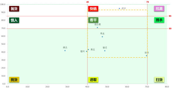 根据九宫格阶梯筛选法则,处在阶梯阴影区为重点拓展城市:徐州处在扫货区与进取区交界,应重点关注;黄线框内的重点投资城市,主要包括商丘、宿迁、枣庄、连云港;挑货区的重点拓展城市有淮北、宿州。