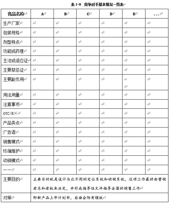 当然,做得不好的产品也知道和竞争对手的差距。大部分供应商没有用好这个数据库,没有进行统计分析,最少要形成两张表格(见表1-9、表1-10)。公司总部一定要在全局上知道自己的对手到底有哪些?他们的优势、劣势、机会、危险在哪里是什么,做到知己知彼。