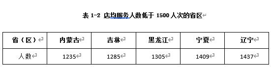 1. 店均服务人数低于1500人次的省区有5个(见表1-2)。