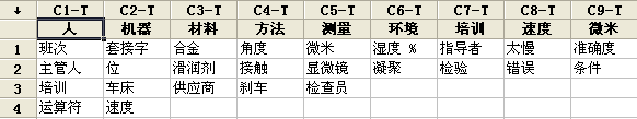 表1-6 人、机、料、法、环、测原因分析