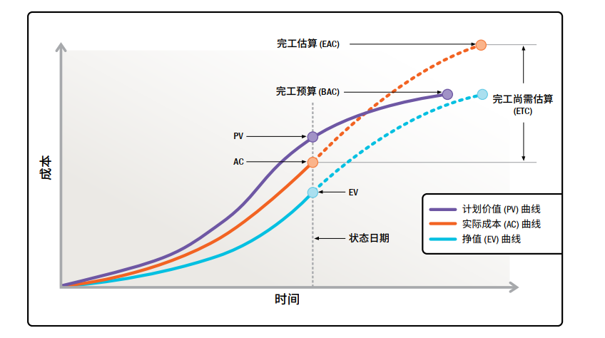 (1)完工尚需估算 (ETC):可预测完成所有剩余项目工作的预期成本。一个常见的测量方法是:完工预算减去挣值,然后除以成本绩效指数。