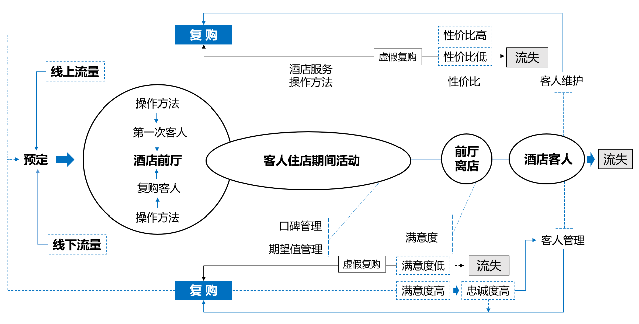 酒店的定位、规模、产品与服务的不同,客人住店期间活动会有所不同,不仅涉及客人对服务和产品的体验和感受,还会直接影响客人的感知价值和满意度。如果满意度较低,复购概率就会降低;如果满意度较高,复购的概率就高。