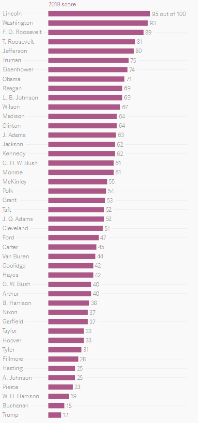 可惜的是,这些成就同样过于单一,完全是从当前利益角度出发,并非是均衡的政治纲领。2019年2月19日是“美国总统日”,由170名顶尖学者组成的美国政治科学学会(American Political Science Association)于当天发布了《2018年历任美国总统评比结果》。调查评比的规则是,所有接受访问的政治学者,以0到100分为评分基准,为历任总统的伟大程度打分,最后统计出完整排名。如图4-1所示。