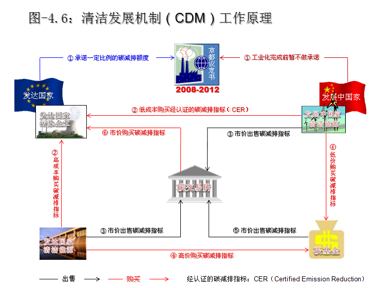 在全球清洁能源发展机制的框架下,每一个签约国政府都承诺了减低碳排放量的总指标和时间表。于是签约国政府会把总的减排指标分摊到每一个污染企业头上。污染企业如果当年的碳排放超过了额定标准,可以出资购买清洁能源企业节约下来的碳指标交差,否则就会面临巨额罚款。另一方面,清洁能源企业可以通过出售碳减排指标而获得发展资金,从宏观上实现了占补平衡的效果,导致全球二氧化碳排放总量的降低。