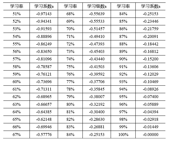 由此可见,人工作业时间所占比例越大,学习率就越低,学习系数就越大,反之则学习率越高,学习系数就越小。工程实际应用中,通常学习率大约在75%~95%之间变动。