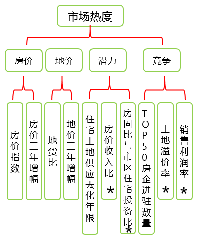 市场热度指标我们从房价热度、地价热度、发展潜力、竞争热度四个方面进行综合评价。