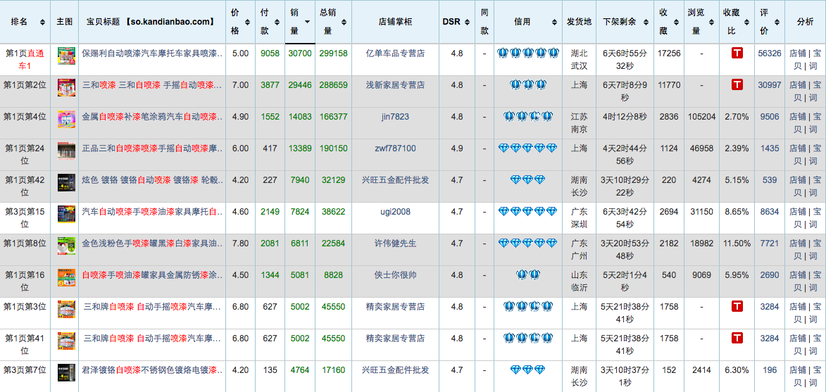 从其他自喷漆品牌的关键词投放可以看出竞品的主要产品组合,保赐利锁定“汽车”“摩托车”等关键词,三和同样锁定“汽车”“摩托车”“自行车”,好顺以“金属喷漆”“轮毂喷漆”为关键词。可以看出来,目前市场销量靠前的自喷漆产品,均为功能全面、各领域都能应用的自喷漆。但是专业度严重缺失。又因汽车车漆修补需求最大,卖家也重点突出车漆修补等卖点。