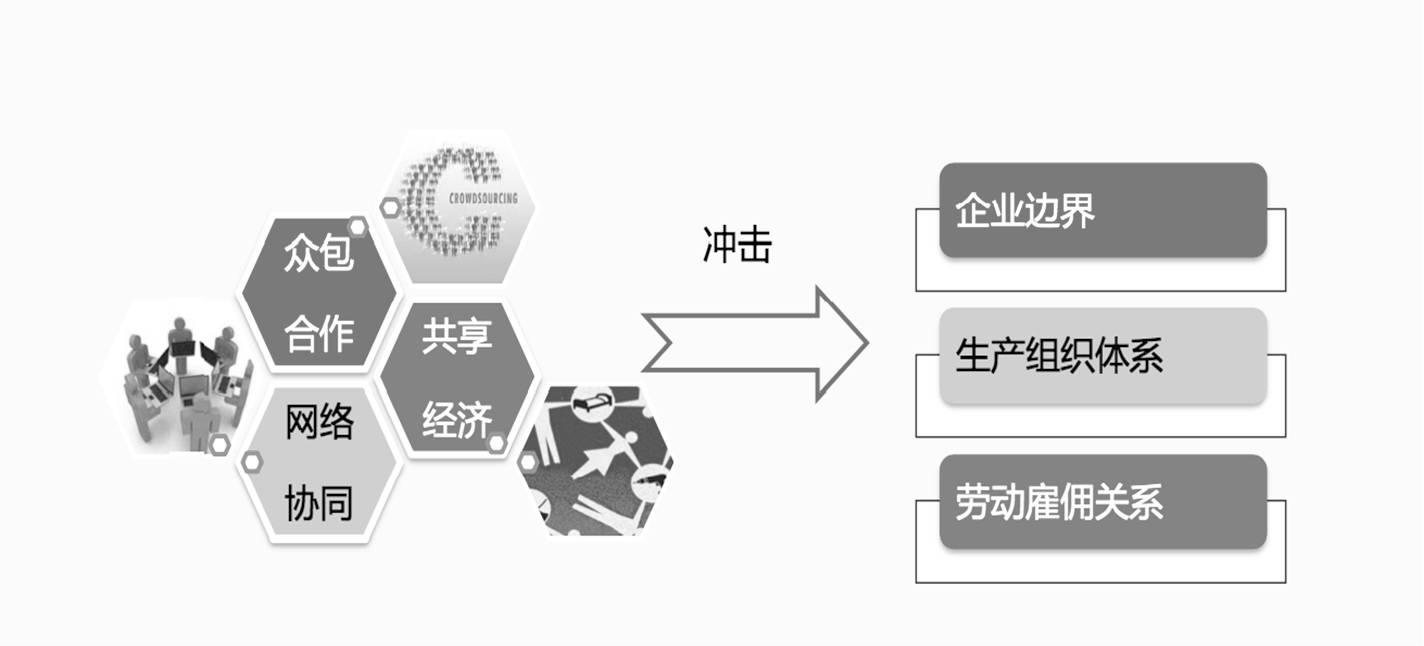 阿里巴巴研究显示,“互联网+”时代大规模社会化协同将是最重要的特征,其中包含共享经济、网络协同和众包合作三个方面,而这种特征将迫使企业重新调整组织边界、生产组织关系和劳动雇佣关系。如图5-2所示。