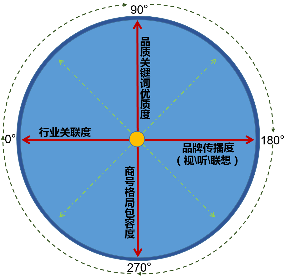 为商号建立一个360°的罗盘,其中有四个象限:商号命名以0°为起点,一是评估“行业关联度”;二是评估“品质关键词优劣度”;三是评估“品牌传播度”(视觉、听觉、联想);四是考虑“商号格局包容度”(商号格局能否适应企业发展壮大)。虽然我们很难创意一个360°完美的商号品牌,但如果这四个象限的评估刻度相加总和能够达到180°,那也算是一个很不错的商号了。当然,无论多好的商号,都必须以满足企业所在地工商局登记注册为前提。