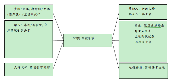 注:适当的过程运行环境可能是人文因素与物理因素的结合,例如社会因素(如无歧视、和谐稳定、无对抗),心理因素(如舒缓心理压力、预防过度疲劳、保护个人情感),物理因素(如温度、热量、湿度、照明、空气流通、卫生、噪声等)。