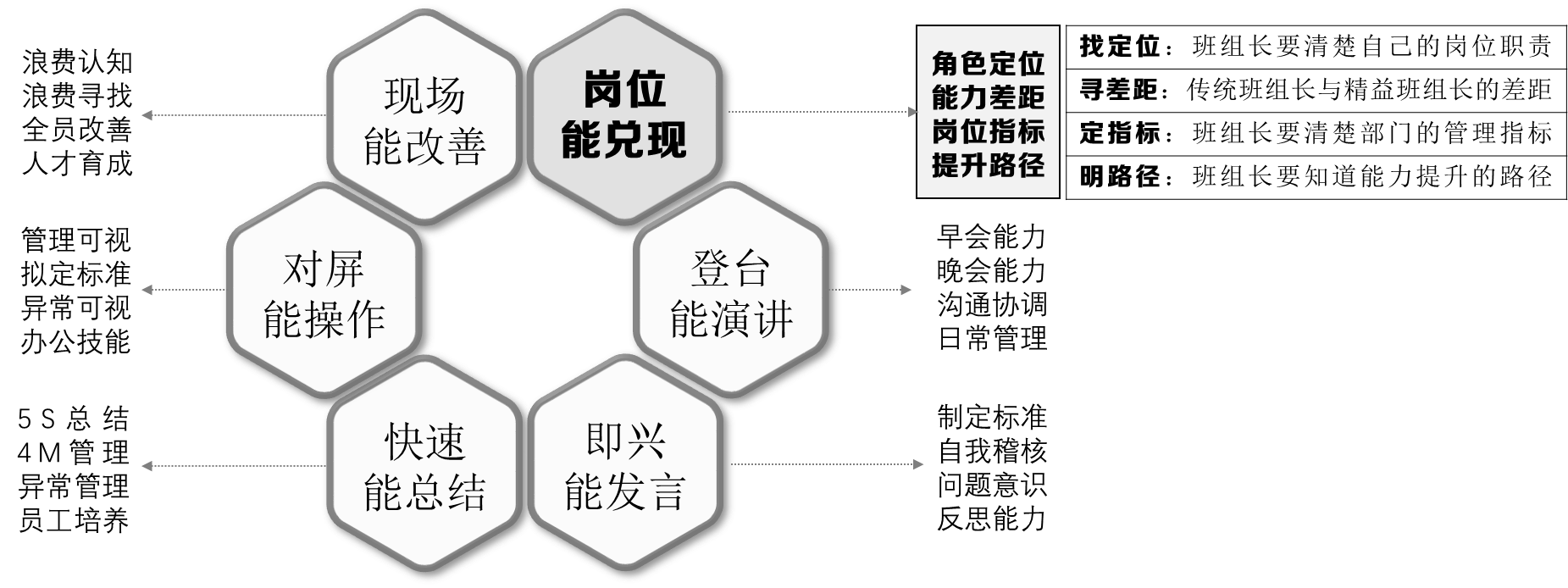 岗位能兑现:基层班组长在班组长这个岗位上,必须要具备了解的是班组长应该做的事情有哪些?针对班组长做的这些事情,具体落实到班组长岗位上的指标如何进行兑现?一个优秀卓越的班组长应该具备的能力有哪些呢?岗位能兑现强调的是班组长要认清自己在企业中的位置及掌握自己岗位的职责要求,反思自己的能力现状,寻找差距,并将自己的管理能力通过企业赋予班组中的指标兑现出来,进而不断的向精益班组长迈进。