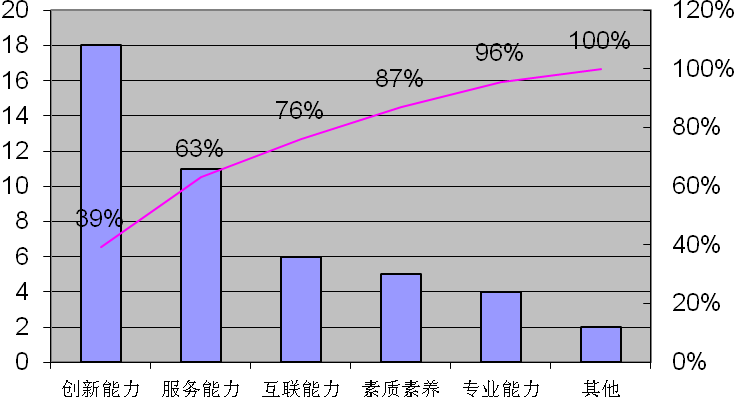 新增维度产生的海量数据通过大数据存储,运用云计算能力,将细化能力内涵匹配常见思维模式,得到量化的能力素质现状。得到能力素质总测评值,包括能力素质总测评标准值与能力素质总测评期望值,通过计算两者比值并比较其大小,可获知公司层面、单位层面、专业层面、各项能力素质层面等人才能力素质现状及排名。在系统内生成雷达图与Pareto图,将员工面临的挑战具象化,例如,通过系统内导出差距柏拉图,员工小宋便可以清晰的看到自己的差距主要集中在创新能力、服务能力及互联能力上,在成长过程中可以有针对性的重点关注此方向,也对自身能力有更加直观的认识。