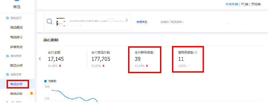 再来看单品的数据,这个也必须要进行分析。要知道单款的走向及趋势,还有买家数及复够率等。如图11-11所示。